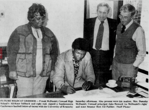 Cawood coaches in the mid 1970s included head coach Boyd Fox (bottom left) and offensive coordinator Johnny Mills (bottom right), along with Joe Campbell, Darwin Walters and Johnny Ashurst,Cawood’s Frank McDaniel is pictured signing to play football at the University of Kentucky.Cawood quarterback David Parks prepared to release a pass during the 1975 season. The Trojans finished the year as regional champs and were among the final four teams in 3A.